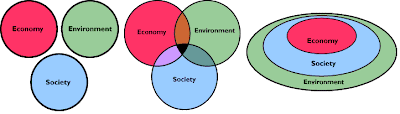 Figur 1. Några olika sätt att se på kopplingarna mellan ekonomi, samhälle och miljö. Genom att mäta ett samhälles ekonomiska utveckling med BNP behandlar man ekonomin som fristående från samhälle och miljö, de flesta inser dock att de olika faktorerna hänger samman och att sättet man mäter ett lands utveckling på i idealfallet bör illustrera detta. En anhängare av ”strong sustainability” skulle förmodligen välja illustrationen till höger och mena att samhället och ekonomin är helt beroende av naturens bärkraft. Bilderna från www.sustainablemeasures.com.